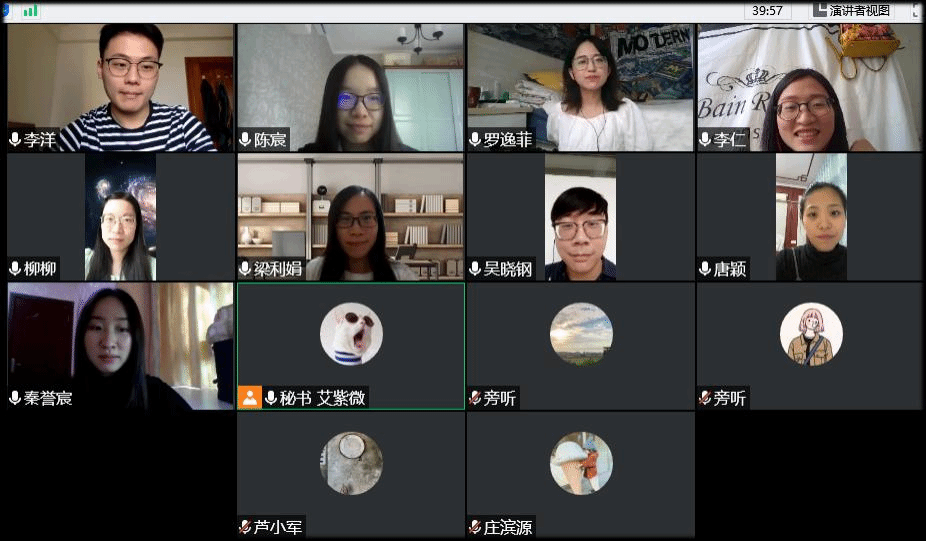 2020年5月14日,实验室硕士二年级成员陈宸,李仁,秦誉宸,唐颖,罗逸菲,李洋,进行了线上硕士论文开题答辩。答辩于14日14:30准时开始,以腾讯会议软件作为答辩平台。由广东外语外贸大学梁利娟副教授,柳恒爽博士,吴晓钢博士担任答辩评委,2019级硕士一年级学生艾紫薇担任答辩秘书。