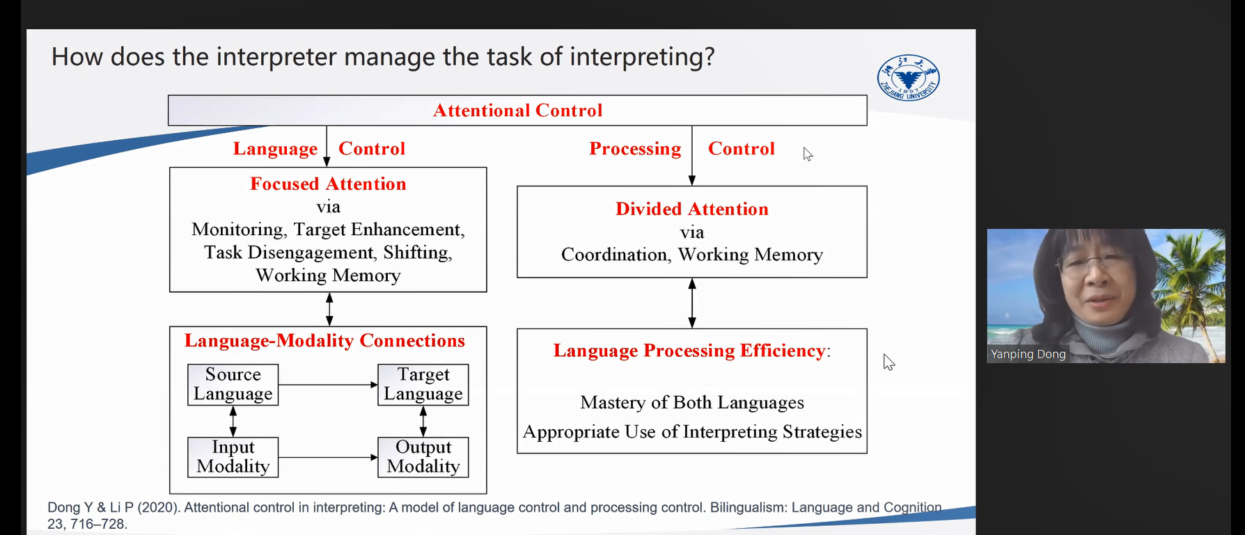 作为本届国际口译研讨会学术委员会成员,董燕萍在会上做了题为“Attentional Control and the Unique Bilingual Profile of Interpreters”的报告。该研究提出了口译的认知控制模型(Attentional Control Model),并基于该模型描绘译员相较于普通双语者可能具备的独特双语能力,如对双语的异同具备更强的敏感性、更善于在双语和双任务间转换、更擅长多任务和注意力分配、更具运用策略解决问题的意识等。