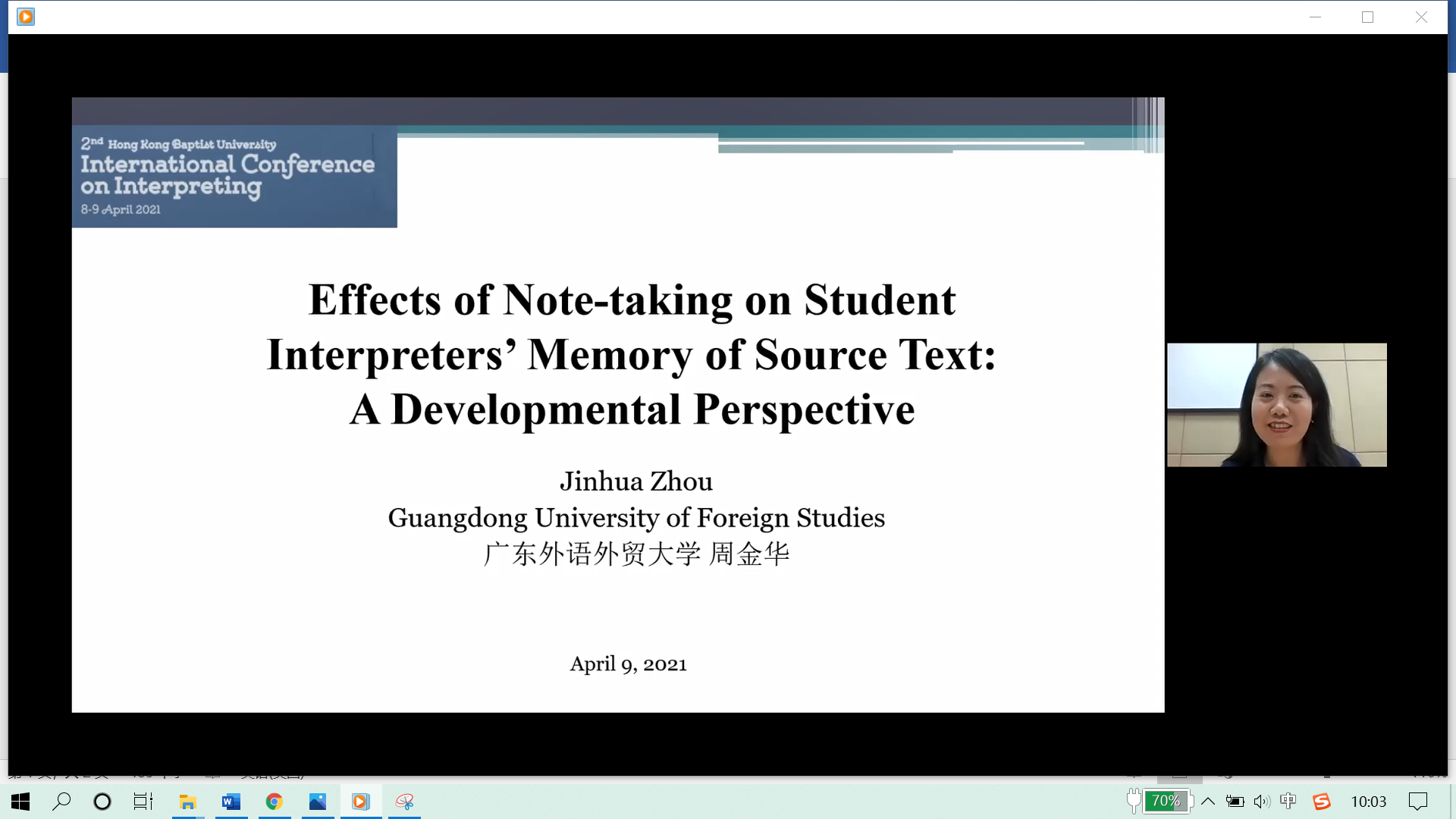 2021年4月8日至9日,实验室顾问委员会董燕萍教授、研究员周金华博士、实验室已毕业的余志斌博士应邀在线参加香港浸会大学举办的第二届国际口译研讨会。