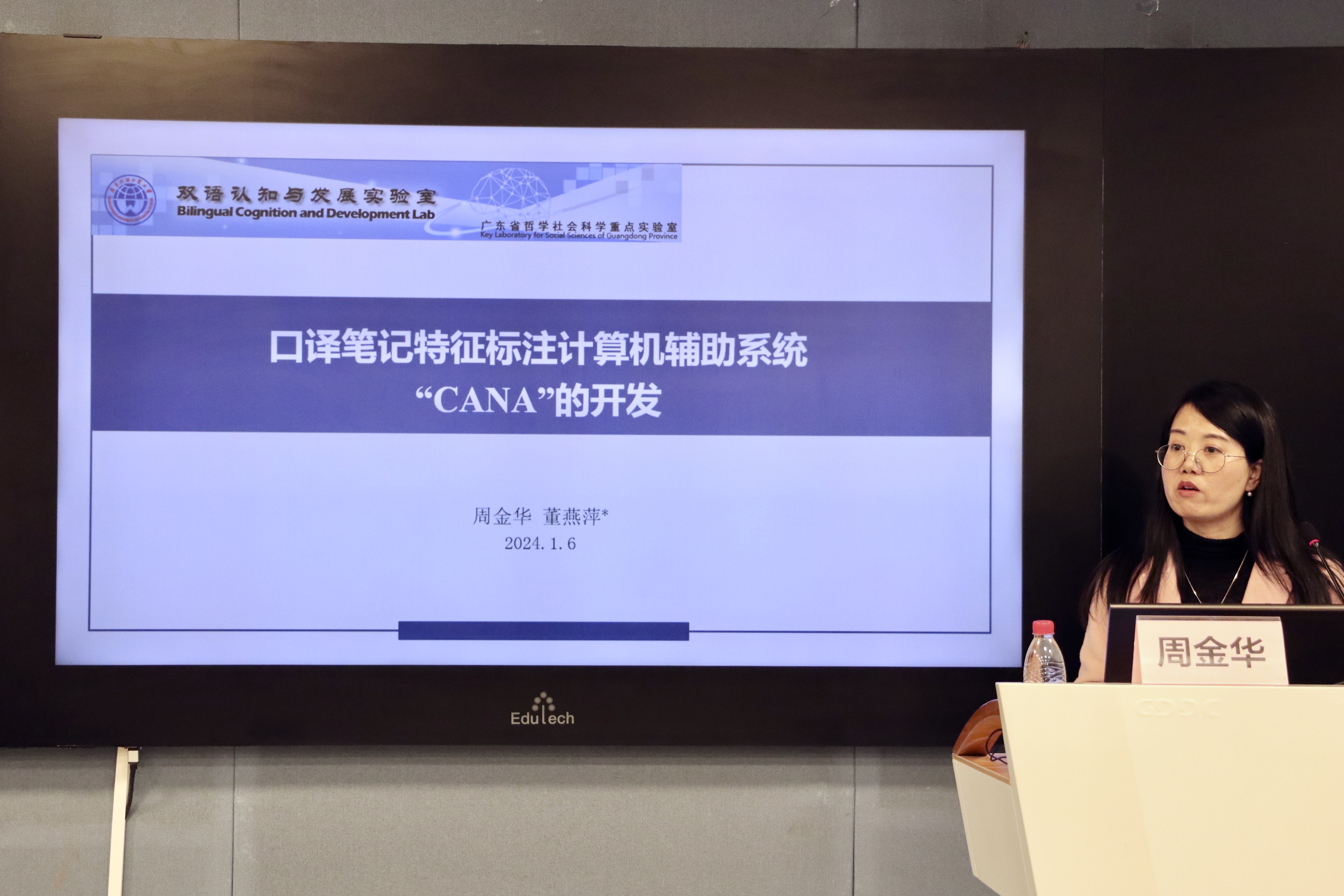 周金华博士以《口译笔记特征标注计算机辅助系统“CANA”的开发》为题,强调了笔记特征标注的重要性,讨论了CANA(Computer Assisted Note-taking Analysis)研发的必要性以及可行性,并介绍了该系统的具体功能。CANA的开发是计算机辅助口译研究的尝试,同时也为未来建立口译笔记语料库提供了技术基础。