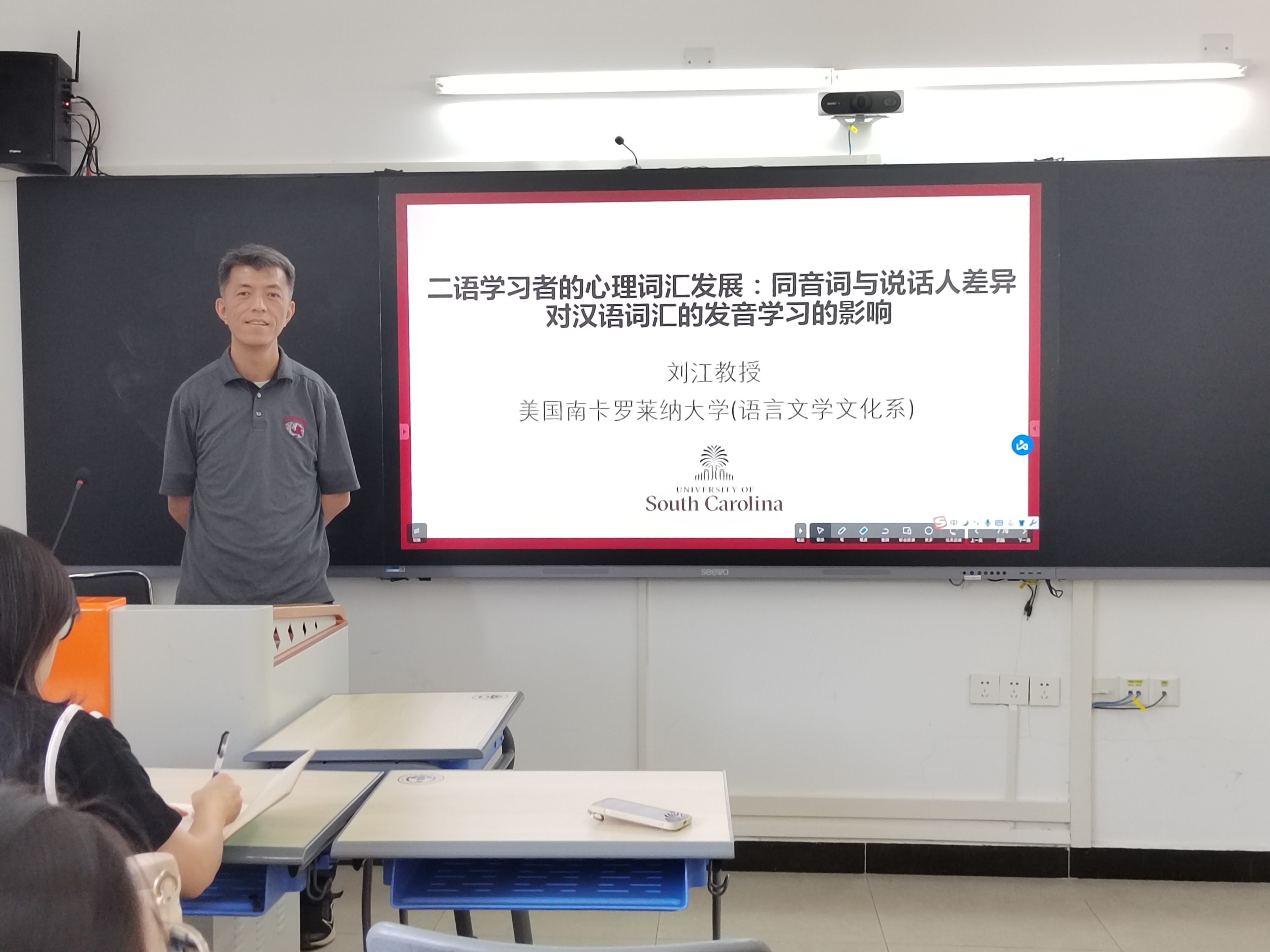 2024年10月24日下午,美国南卡罗来纳大学语言文学文化系的刘江教授应双语认知与发展实验室邀请作主题报告,题为《二语学习者的心理词汇发展——同音词与说话人差异对汉语词汇发音学习的影响》。此次讲座在白云山校区一教南楼309室举行,由实验室兼职研究员林洁绚博士主持。参加讲座的包括实验室副主任梁利娟教授、实验室兼职研究员蔡任栋博士以及其他校内师生。