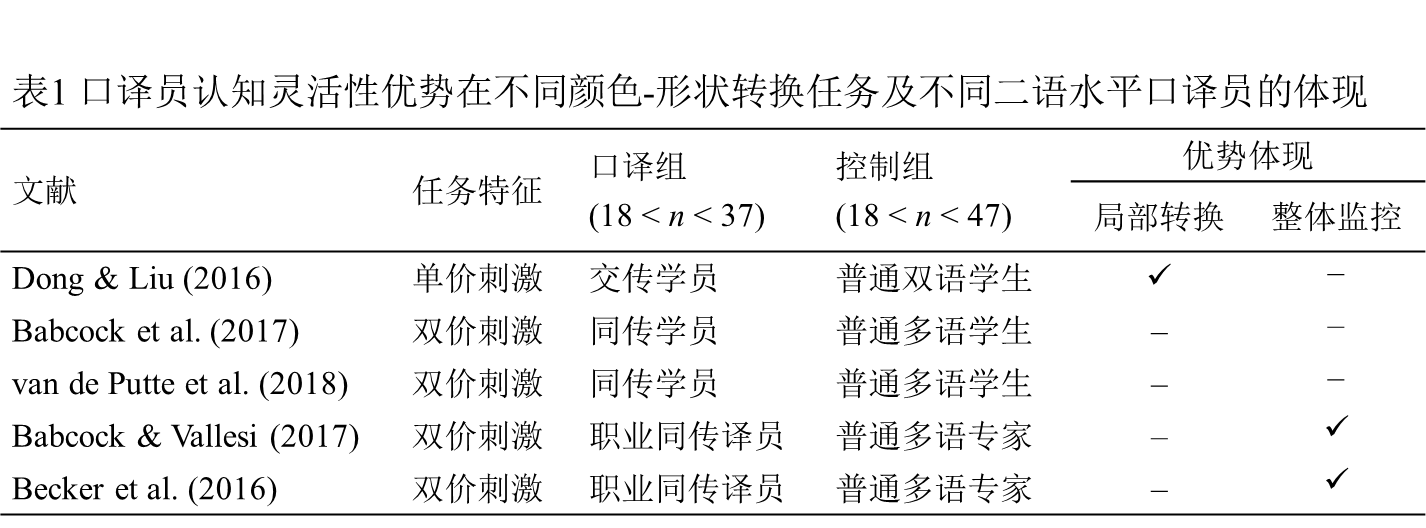 迄今为止,口译员认知灵活性优势在上述两类指标上都有体现,但各研究间的结果并不一致。表1总结了前期使用颜色-形状转换任务测量口译员认知灵活性优势的相关发现。