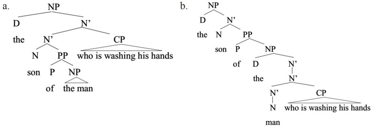 如上图所示,名词短语中心词son在句法树形图上的位置总是比man高,因此被称为高位名词,man为低位名词。在该结构中,关系从句CP既可挂靠son形成高挂靠(a),也可挂靠man形成低挂靠(b),因此产生歧义,形成两种结构。它们虽词序一样,但挂靠关系不同,是探讨线性或层级递增的理想结构。