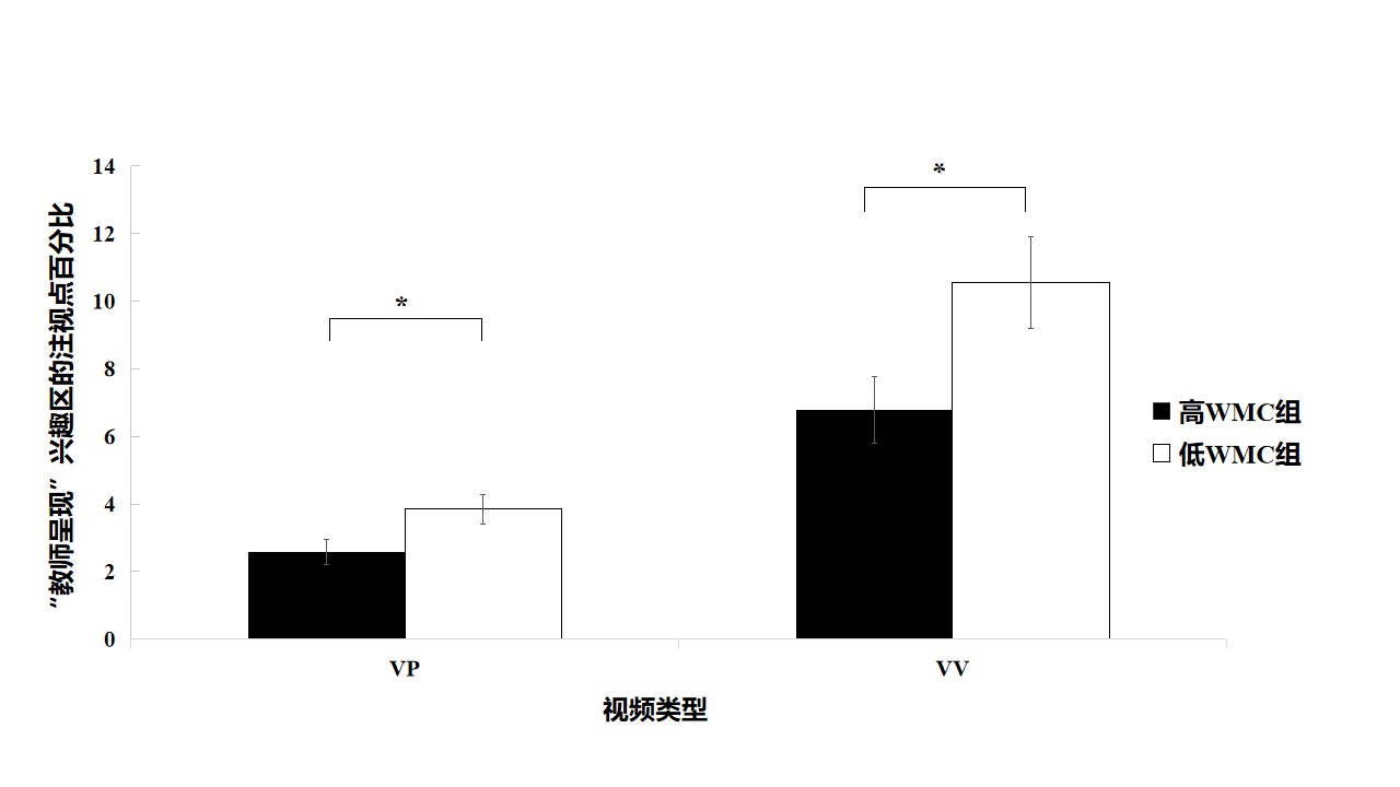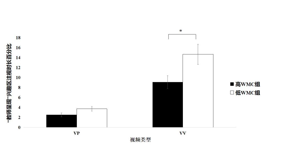 与此同时,眼动数据结果显示:在观看有老师呈现的视频时(PV和VV两种视频类型), 低WMC组比高WMC组花了更多时间注视老师这一兴趣区。