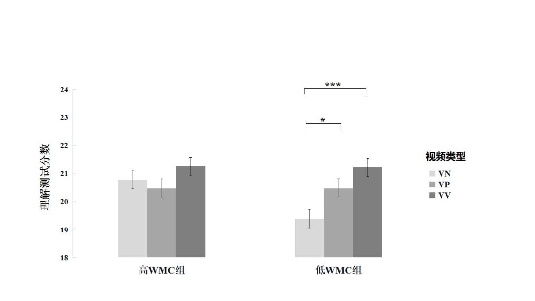研究结果发现,对于低WMC组,教学视频中老师形象的存在(无论是以静态图片还是动态视频的方式呈现)显著地提高了其理解测试得分。然而,对于高WMC组,老师的存在没有对其学习成效产生影响,即他们在有/无老师的视频条件下理解测试得分没有显著差异。