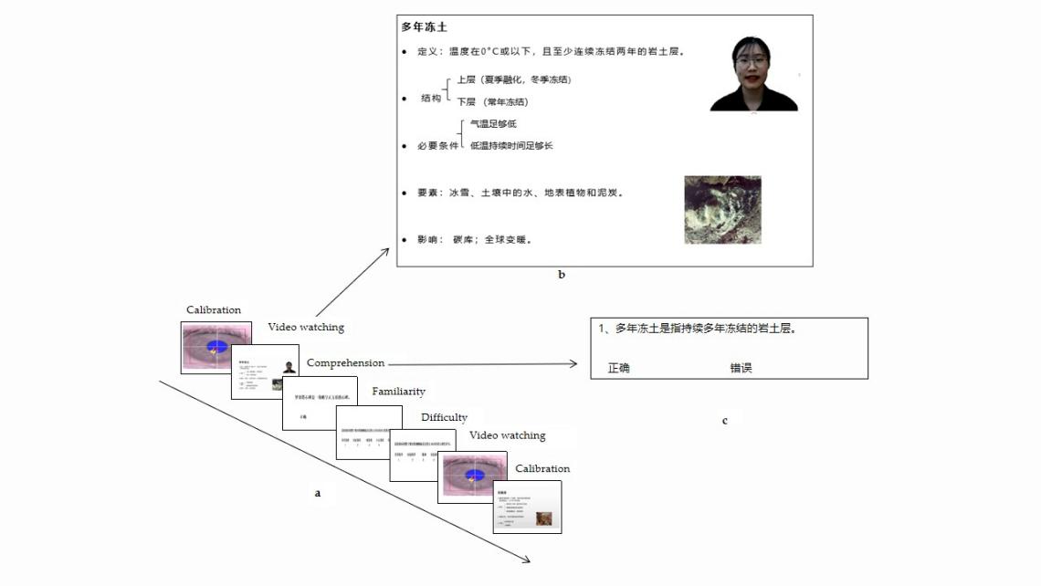 图1 实验范式(a), 有教师讲解的视频条件(b), 理解测试问题示例(c)